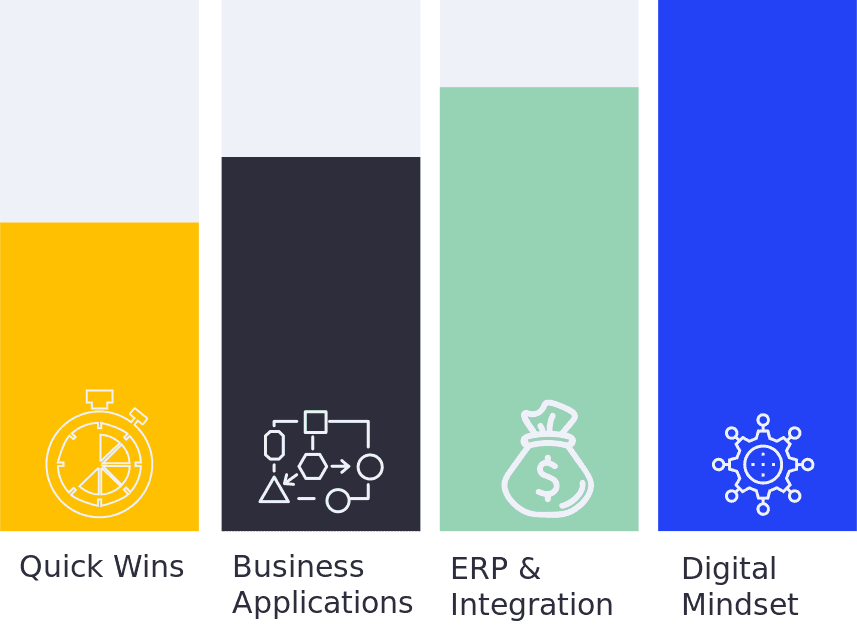 Changing the ways of working means changing the mindset around technology. It is to enable each individual in the organization to voice their issues, concern, and point out inefficiencies and risks in a rewarding way. Developing and retaining digital talent increases the likelihood of optimization, automation, and innovation. The whole organization needs to take part in this journey, as they step through the following stages: